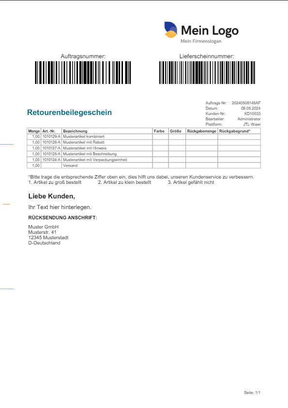 Übersichtliche Premium JTL Vorlage “Retourenbegleitschein” für den professionellen Geschäftsauftritt deiner Marke. Das klassische und zeitlose Design sorgt für gute Lesbarkeit und ganz allgemein für eine hervorragende Übersichtlichkeit. Kunden und Lieferanten können Informationen schnell und einfach aufnehmen, das sorgt für Zufriedenheit und Vertrauen in deine Marke.